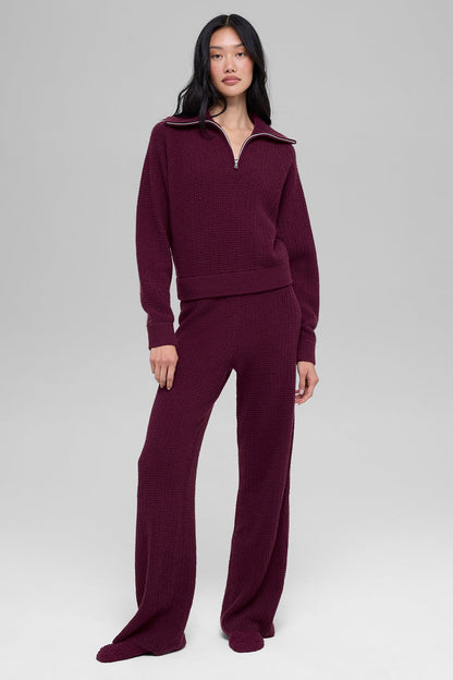 From studio to street, this quarter-zip will be your new go-to. With its soft feel and relaxed fit, its no wonder this pullover is one well be wearing all season long. Pair it with the Cashmere Plush Waffle Pant for an elevated take on a cozy outfit.