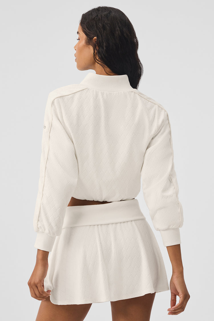 Give retro vibes in the Doubles Only Jacket, designed with a dimensional ribbed finish and a cute stand collar. It has piping down the arms, zippered pockets, and a full-zip front. Plus, the hem is elastic, and designed to hit at the natural waist. Pair it with the matching Bra and Jacket to serve up major style points.