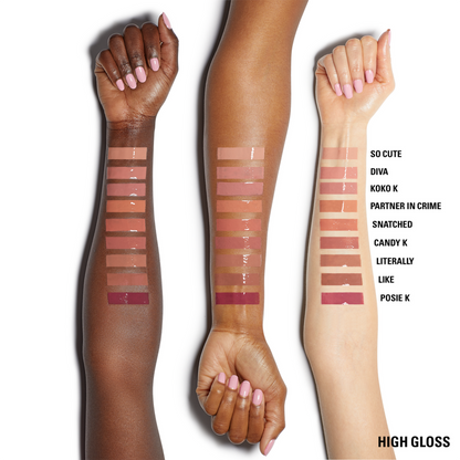 KYLIE COSMETICS High Gloss offers multi-dimensional shine and color. It glides on easily to leave lips looking luminous and glossy without stickiness.