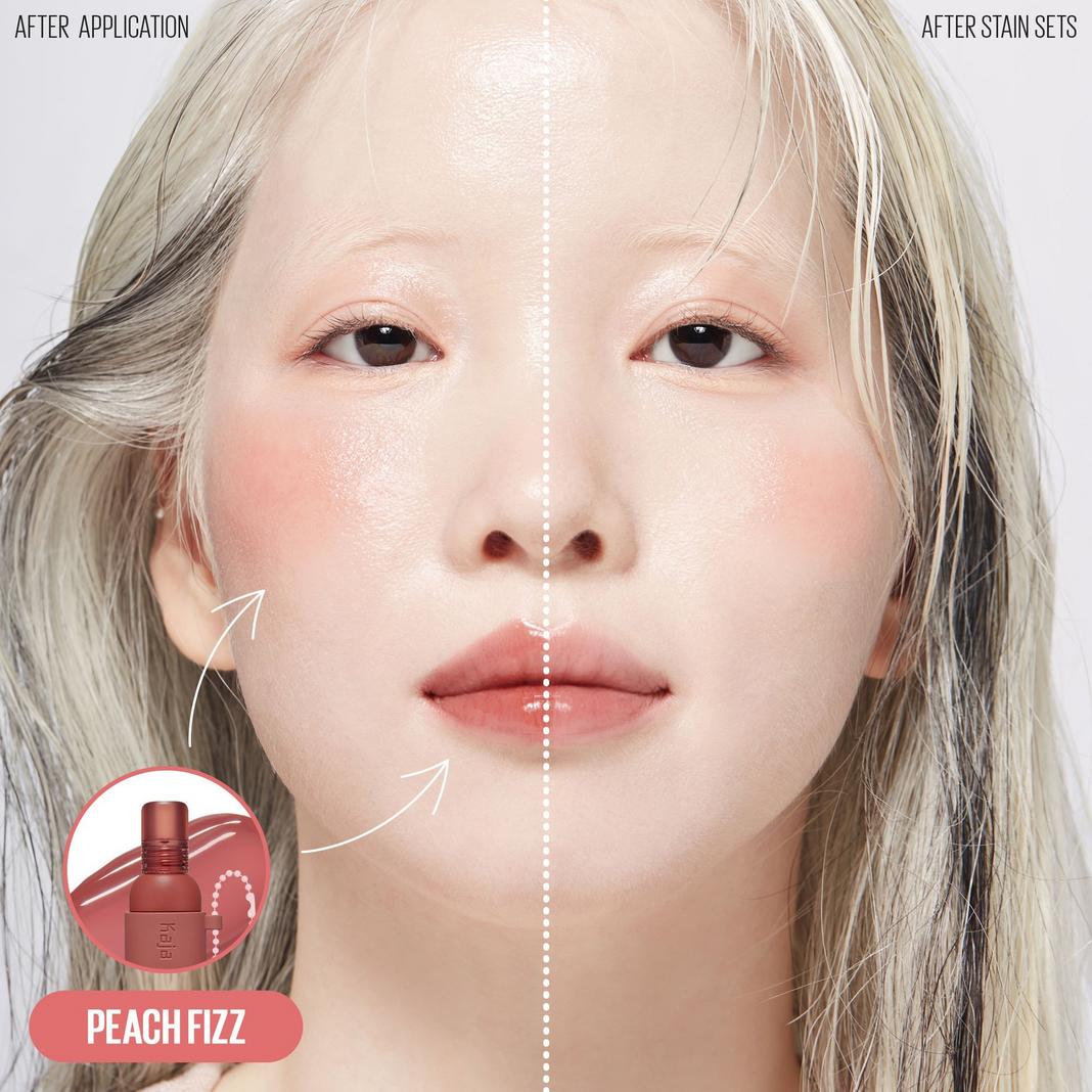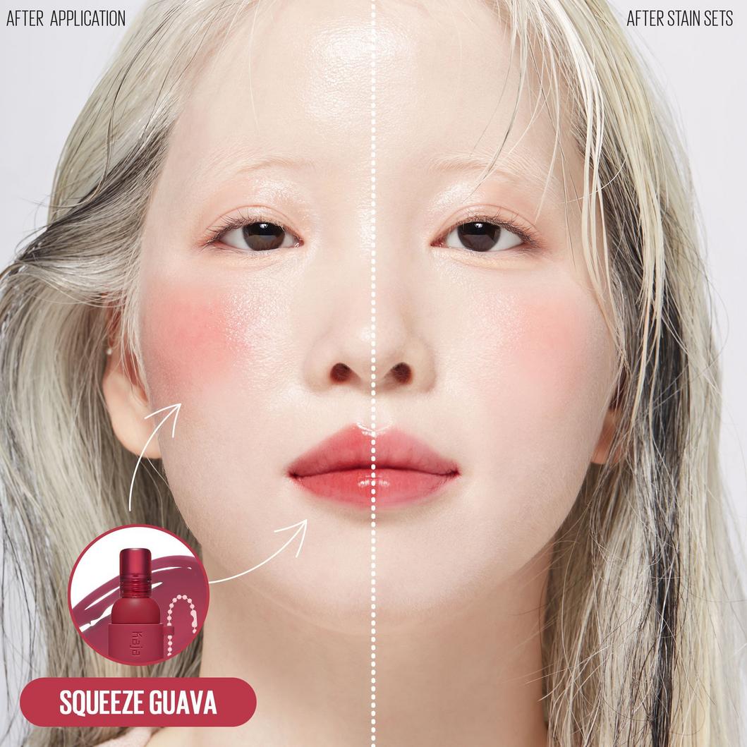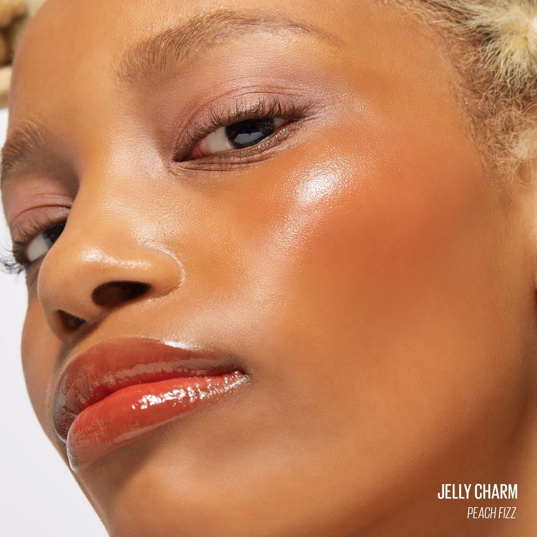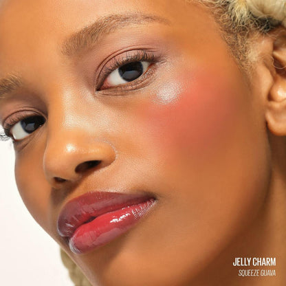 Experience a jelly pop of color with Kaja's Jelly Charm Glazed Lip Stain & Blush. This versatile product is lightweight, buildable, and moisturizing, featuring a convenient keychain for easy on-the-go application.