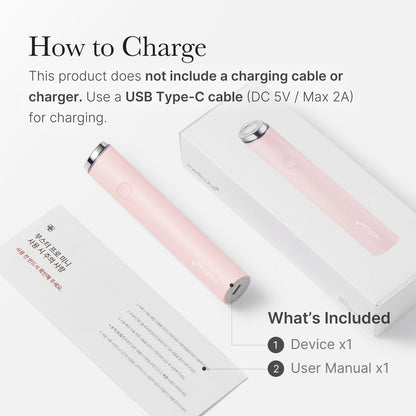 To charge the product, use a USB Type-C cable with an input voltage of DC 5V and a maximum of 2A. If you have health concerns, are under medical treatment, or experience pain or unusual symptoms during use, discontinue use immediately. Repeated use on the same area or improper usage may cause skin damage. If any abnormalities appear, cool the area and consult a medical professional.